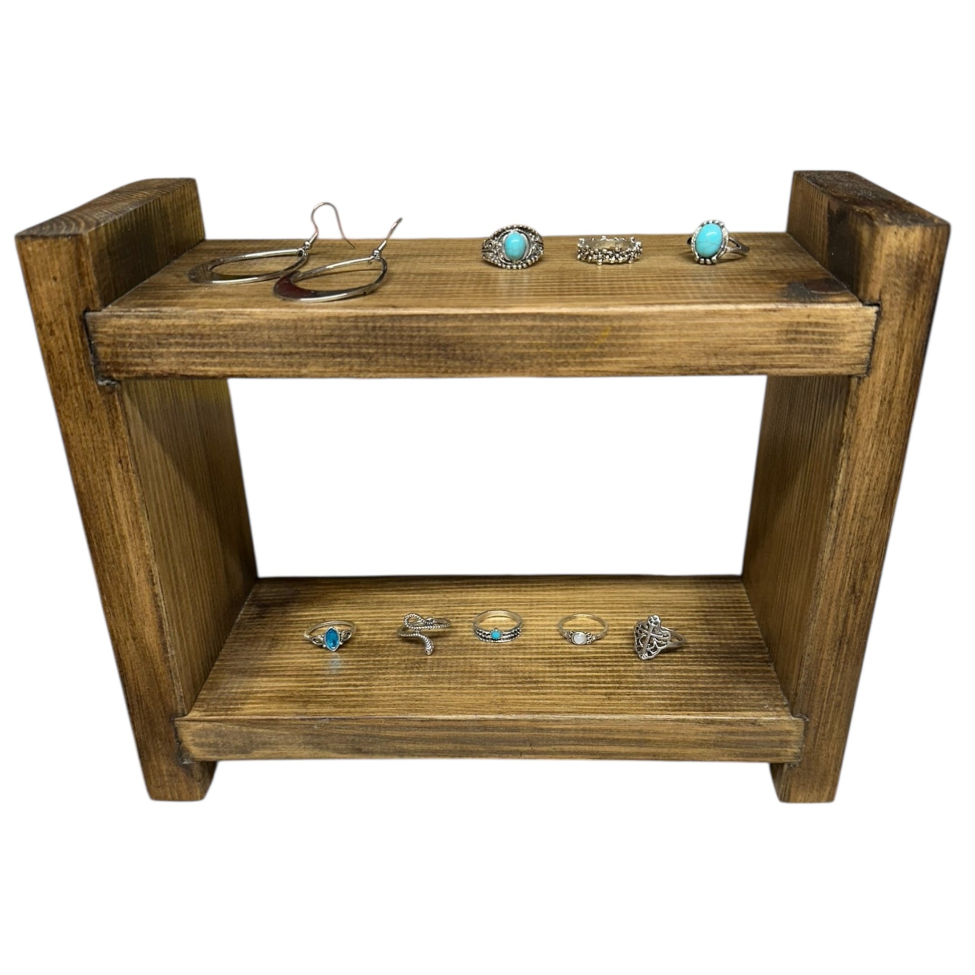 Showcase your products beautifully with this handcrafted two-tier wooden display stand. This piece is perfect for displaying any small items.